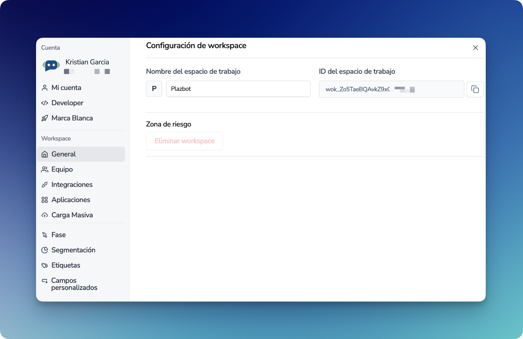 El Workspace ID será una de las principales claves para la conexión con el API, la deberás usar en todos los servicios.