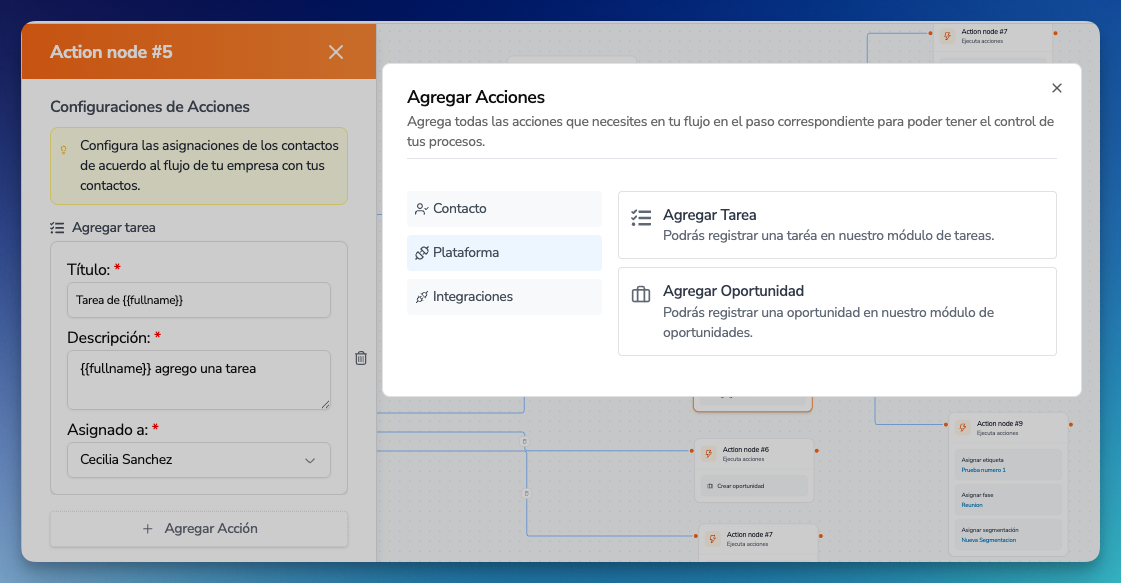 - Flujos conversacionales visuales integrados con condiciones y acciones.