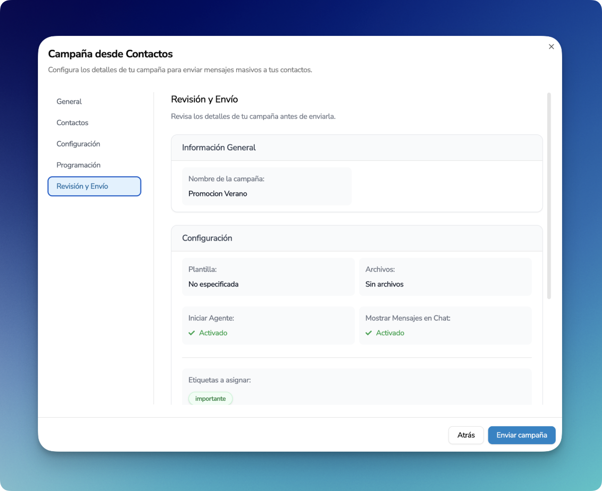 - Contactos: Revisa la cantidad de contactos que tienes en la plataforma.