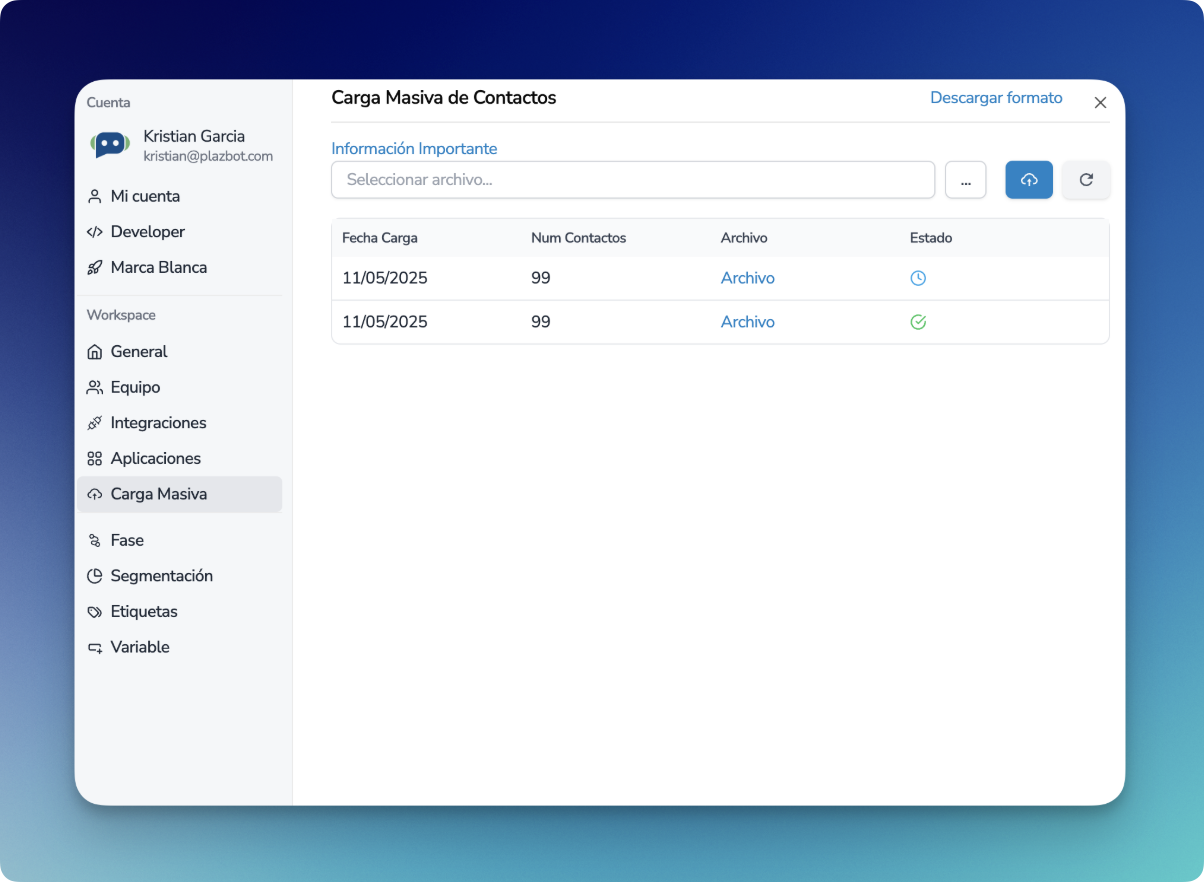 👉 Ahora podrás realizar la carga masiva de contactos de Whatsapp a la plataforma. Es importante para una migración de datos.La opción se encuentra en: Configuración → Carga Masiva.