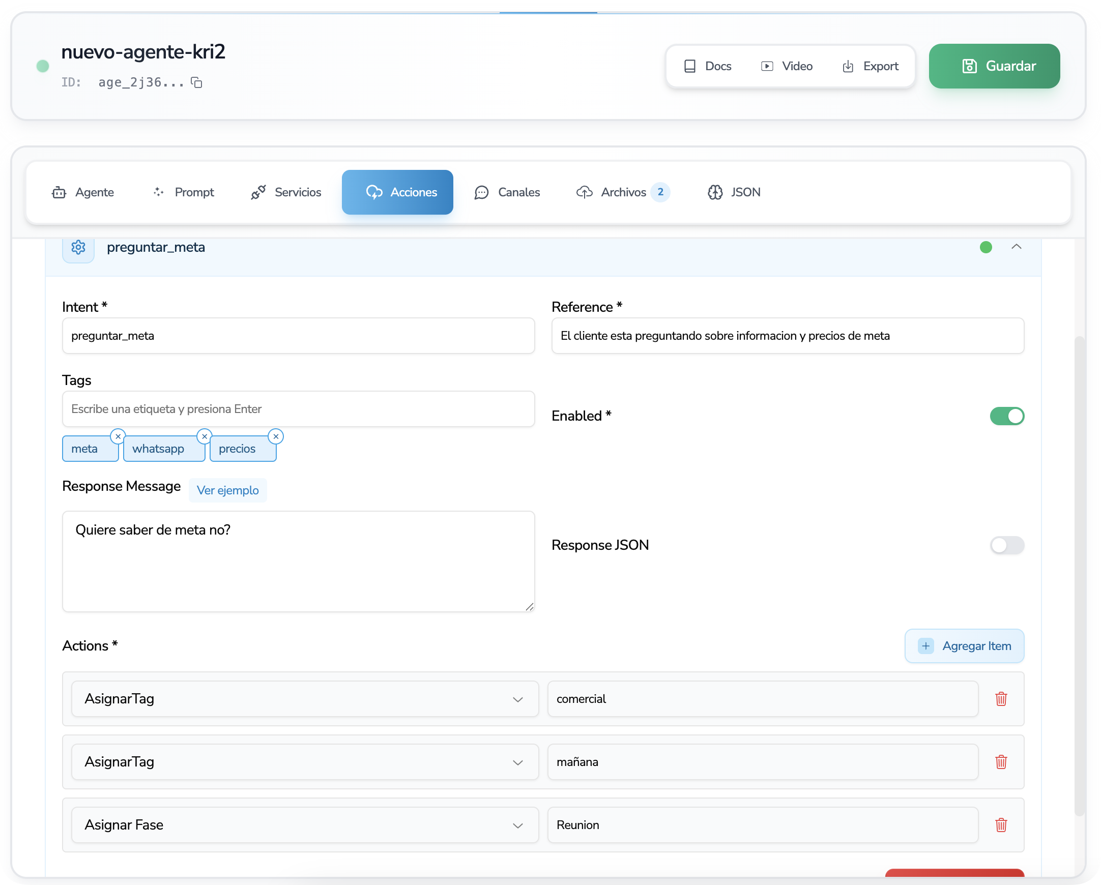 | responseIA | Booleano que indica si después de ejecutar las acciones, el agente debe continuar con el flujo de IA (true) o usar solo el responseMessage (false). |
