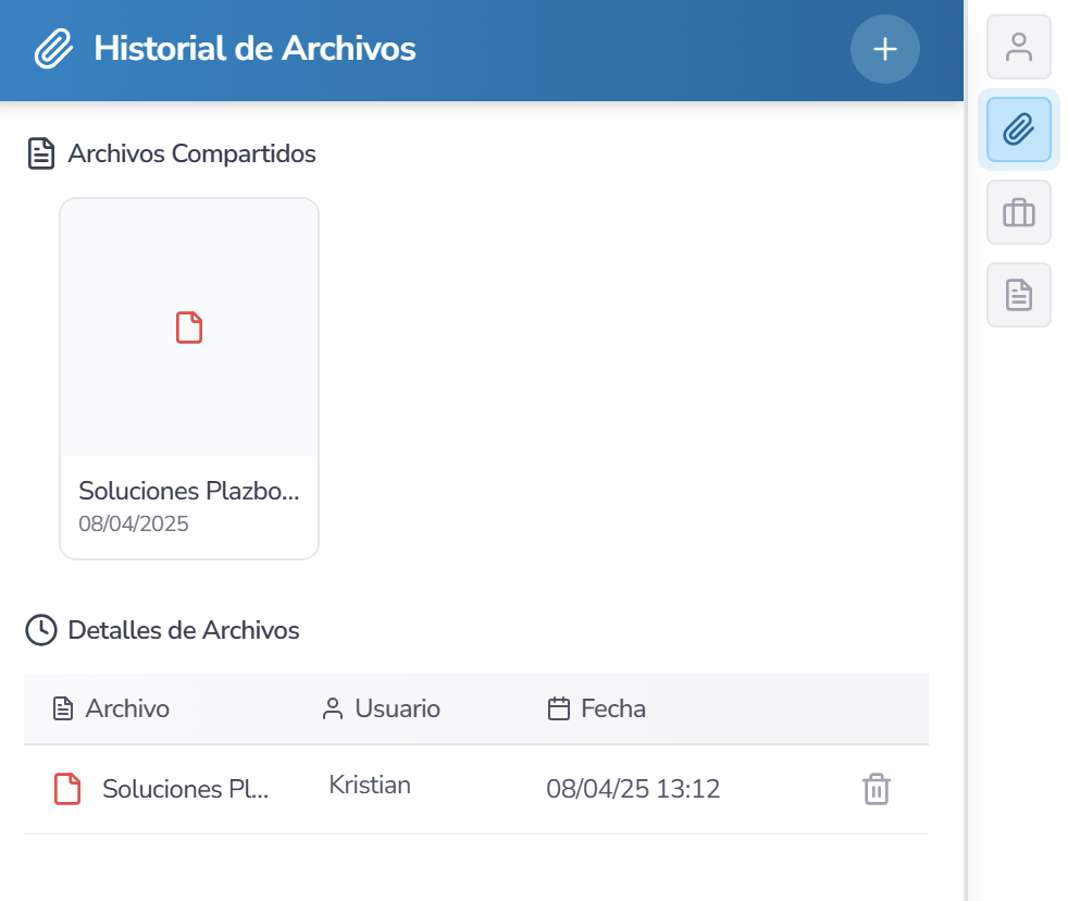 Para poder adjuntar archivos en el contacto se tiene que ir al icono Adjuntar de la derecha y poder realizar las acciones de Agregar Archivo. Los archivos que se envía el contacto y los agentes dentro del chat, también se podrán visualizar en esta pantalla.