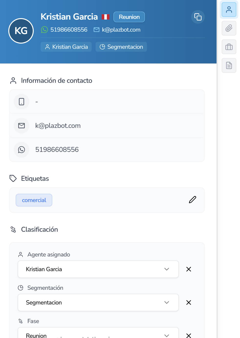 Para actualizar la información o los atributos del Contacto, se puede ir a la derecha de la pantalla y presionar el icono de la persona, el cual desplegará una pequeña ventana donde podrá modificar la información del contacto.