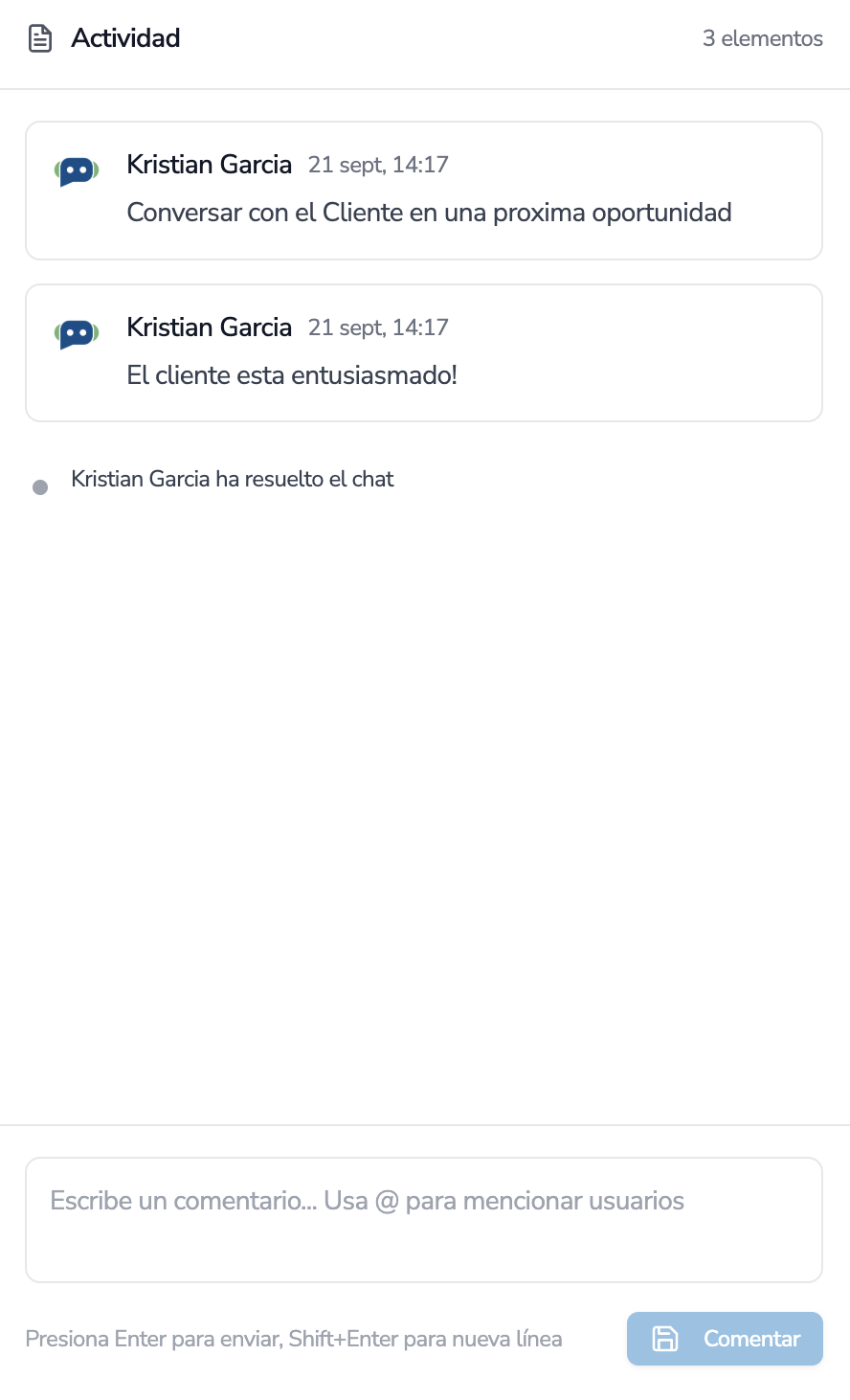 Dentro de la plataforma cualquier actualización del contacto, se registrará como un movimiento en el Historial y se podrá visualizar, cambios de atributos o comentarios insertados de los agentes.