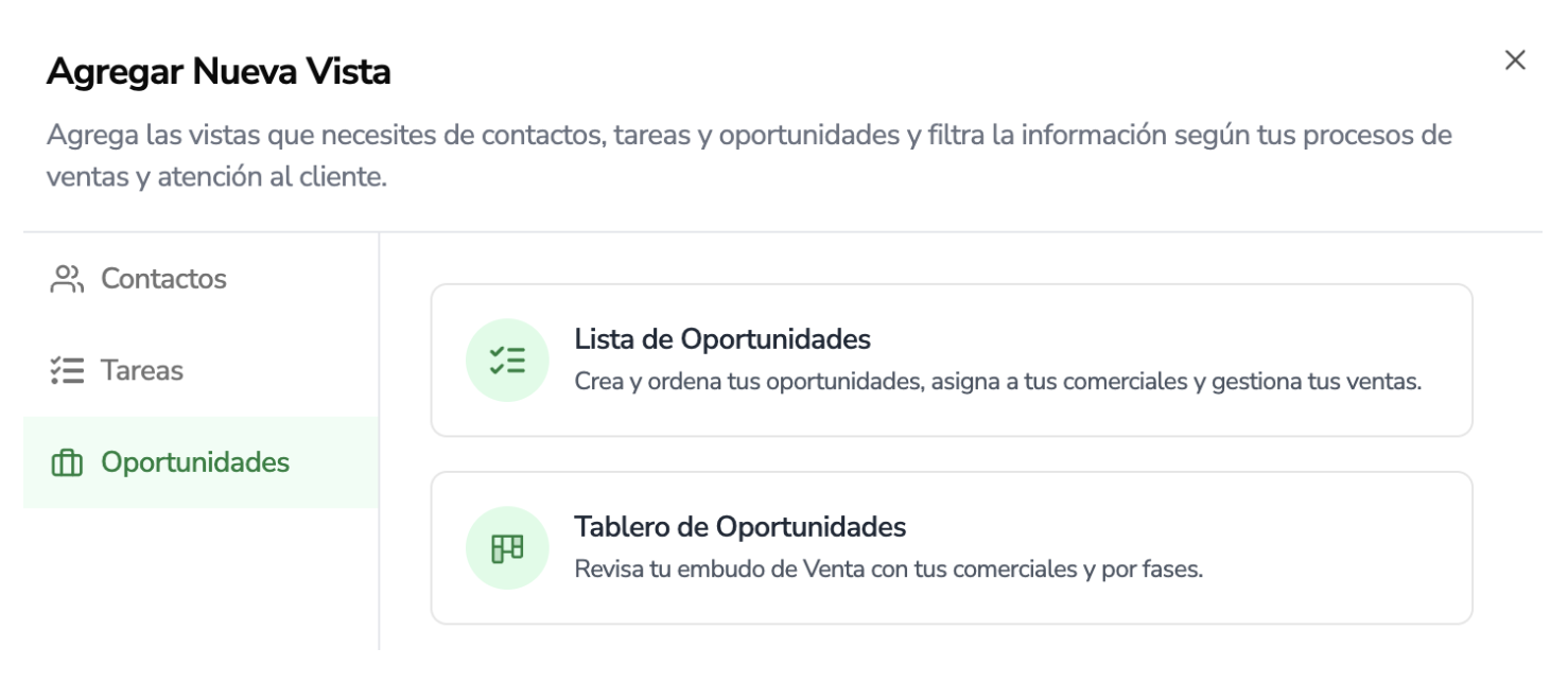 Para la vista de oportunidades, tendremos dos tipos de vistas.