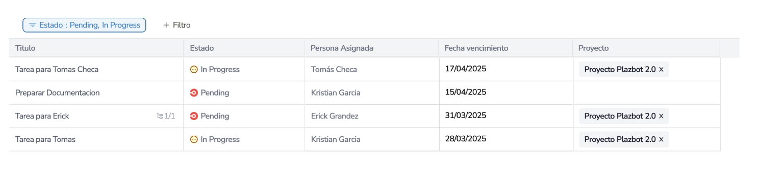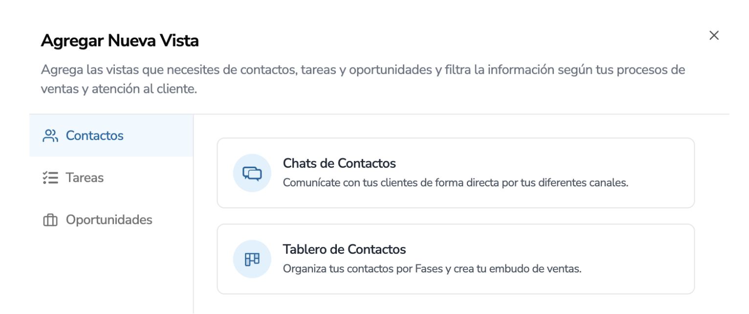 Dependiendo del tipo de Vista que se tiene, ya sea Contacto, Tareas u Oportunidades, vas a poder filtrar la información en base a los campos que tiene cada entidad, de esta forma vas a poder tener mejor orden en la gestión de tus procesos de atención al cliente y ventas.