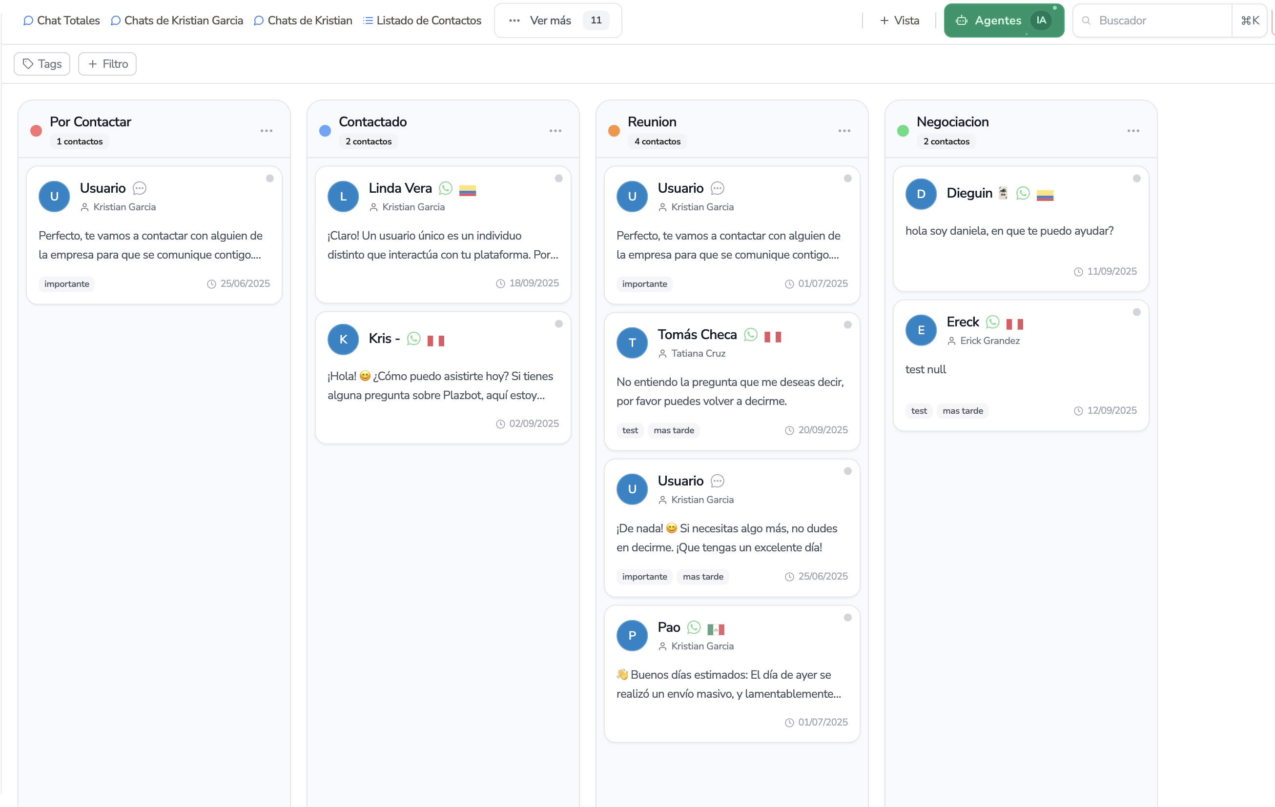 Para la vista de contactos tenemos dos tipos de Vistas que son la vista de Chat en línea, que es la centralización de Canales de Atención y la vista de Tablero de Contactos, donde podemos visualizar a todos los contactos por Fases en Columnas, esto te ayuda en caso llevas tus contactos en embudos de venta.