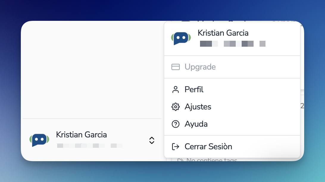 Para poder conectar el número de Whatsapp a la plataforma es importante poder ir a la configuración del Workspace que se encuentra en la parte inferior izquierda de la pantalla. Nombre de Usuario → Cuenta