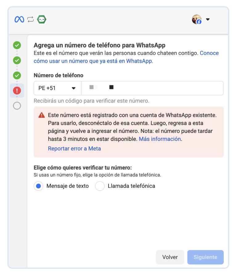 🚨 En caso el número se encuentre instalado en otro Whatsapp Personal o Business, le saldrá el mensaje de error de Meta.