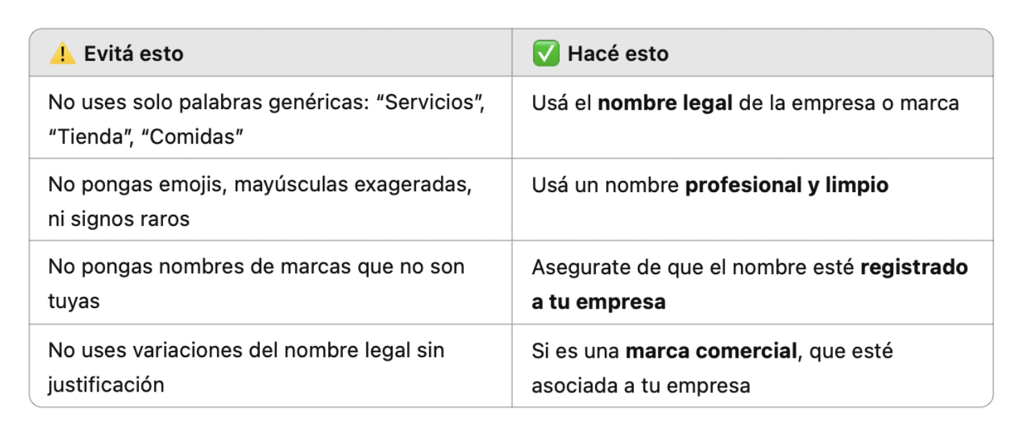 Es sumamente importante poder tener estas recomendaciones claras al momento de colocar el nombre de Whatsapp ya que es el que aparecerá en los celulares de los clientes. Meta tiene políticas estrictas. Estas son las mejores prácticas para que no te lo rechacen: