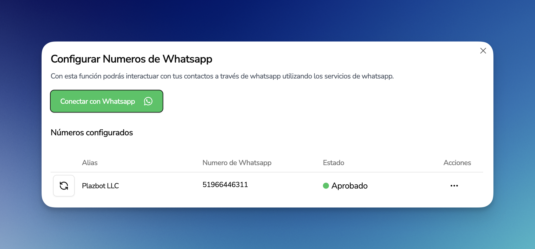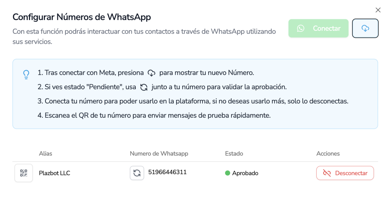 Cuando regresas a la plataforma debes de seguir los pasos de la pantalla, que es Primero presionar el botón de Descargar el cual hará que aparezca el número de Whatsapp que acabas de conectar. El número aparecerá como esta pendiente de aprobación con un indicativo amarillo. Pendiente (Amarillo) Rojo (Rechazado) Verde (Aprobado)
