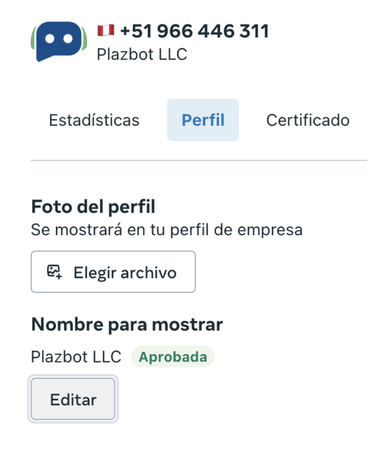 En caso salga Rechazado con el indicativo rojo, entonces tiene que visitar la pagina en Business Meta que lo ayudará a poder encontrar su número que se ha registrado en su portafolio comercial. Al ingresar al número podrá enviar, presionando el botón Editar, de nuevo el nombre a aprobar.