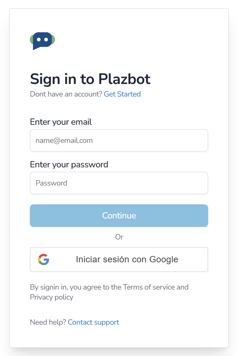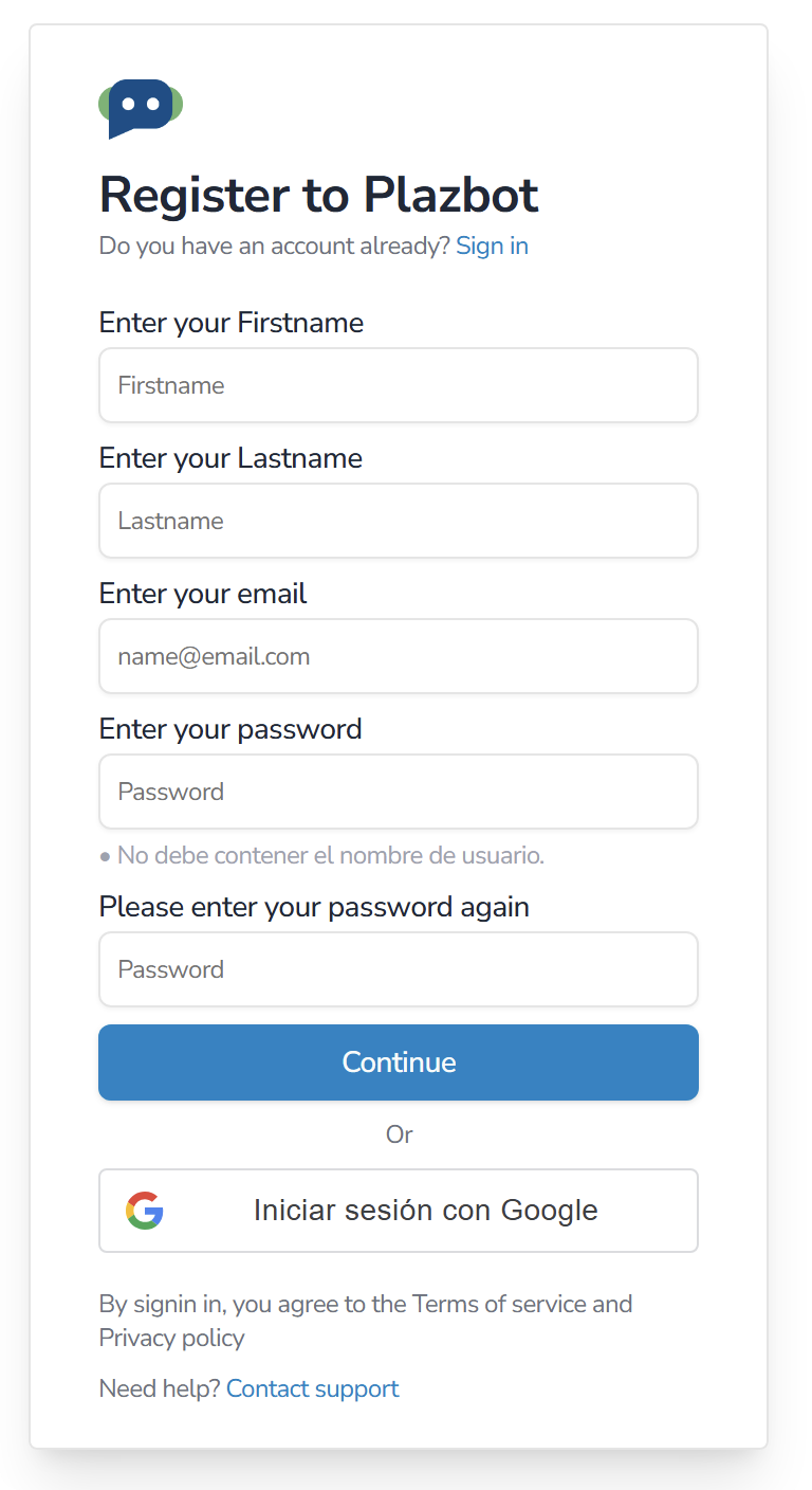Para iniciar en Plazbot es importante poder registrarse en nuestra página principal. En esta sección debes de ingresar a Crear Cuenta.